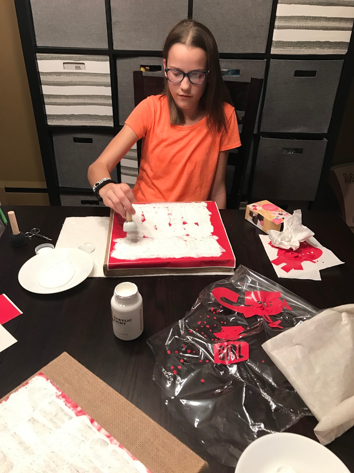 Then I cut the template out of vinyl and added it to the burlap canvas and we painted away!  It was better to use the daubers and sponge them up and down and not move side to side.