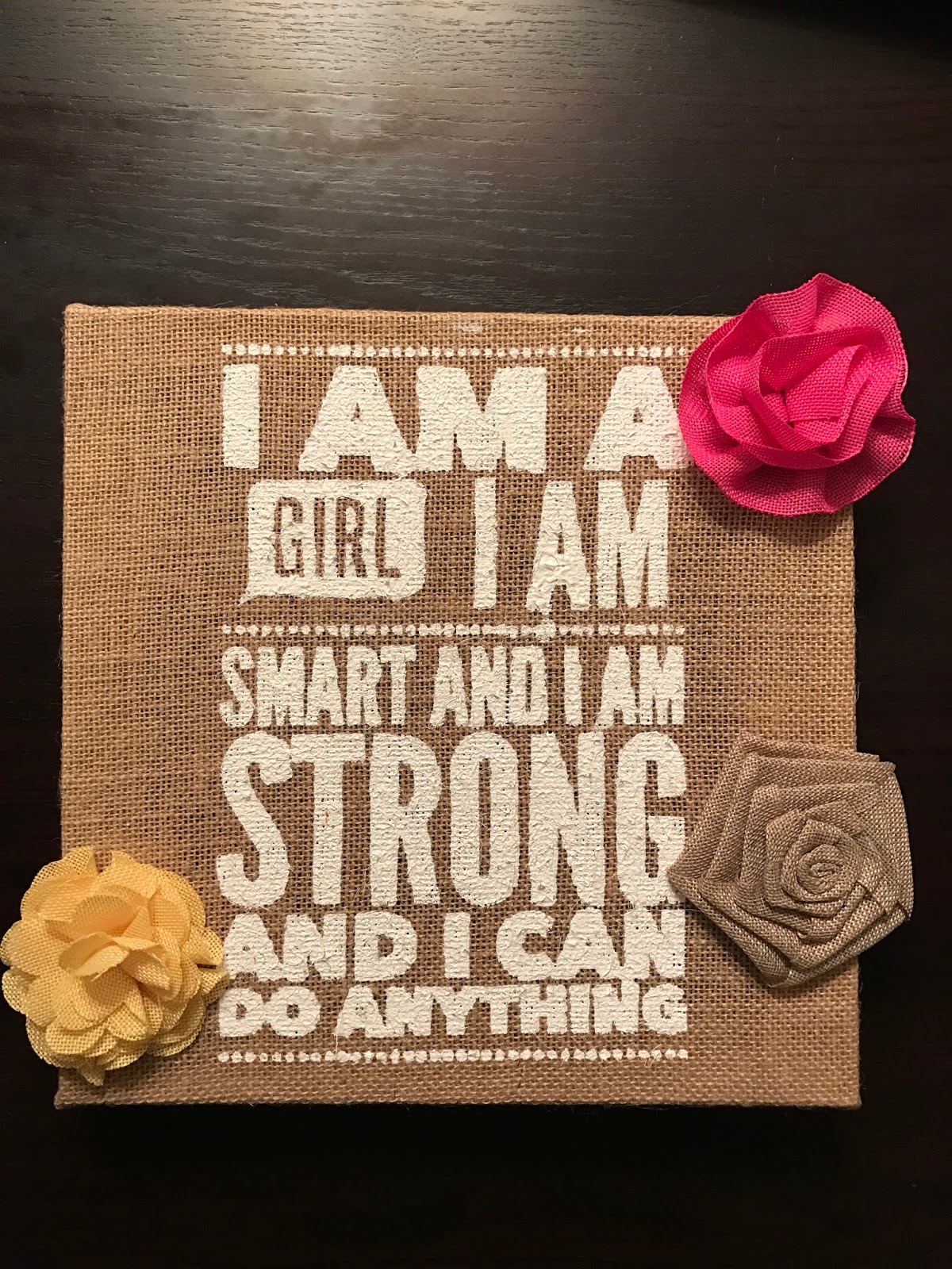 This is the finished product, and my sister had given my daughter these super cute flowers for her birthday!  We did find the bigger letters seemed to work better because of the thick texture of the burlap.  I'm sure on a smooth surface the smaller letters would have been fine.