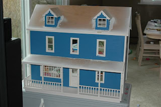 Oooh the dollhouse! The nicest lady at my moms work thought of us when she needed to find a good home for her dollhouse! Apparently they were cleaning house and it needed to go! It has always been a dream of mine to own a dollhouse, and I can't believe we get to do this for our little girl. Some of the electrical was done already, but Jamie added to it. Now to paint, wallpaper, carpet, shingle... just like a real house!!! Here are some pics of Ella playing with it, even before we did anything to it, and another of it painted. Jamie plans on putting the shingles on this week!