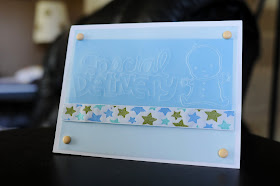 I also used Create A Critter for "special delivery" and Stretch Your Imagination for the baby. I flipped the design in Design Studio as the "debossed" side shows up in white on the colored vellum! Very cool!