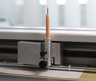 Again, leaving the mat in the machine, I carefully replaced the blade with the Chomas Creations mini gel pen holder and pink glitter mini gel pen and drew the graph design on my card.